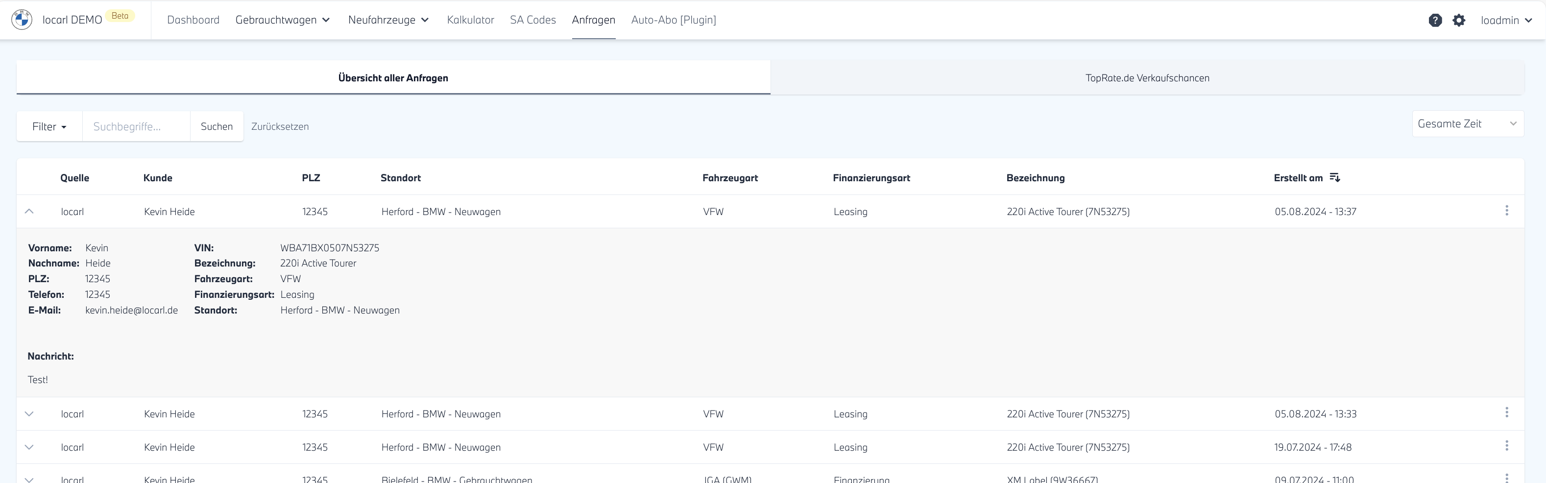 In der neu geöffneten, tabellarischen Ansicht finden Sie alle über die locarl Fahrzeug-Darstellung auf Ihrer Website eingegangen Anfragen und die von TopRate mit allen relevanten Informationen.