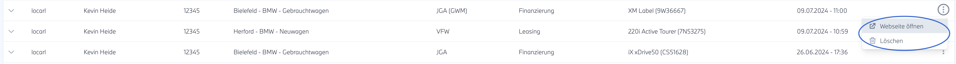 Sie finden alle über die locarl Fahrzeug-Darstellung auf Ihrer Website eingegangen Anfragen auch im Login Bereich von locarl.
