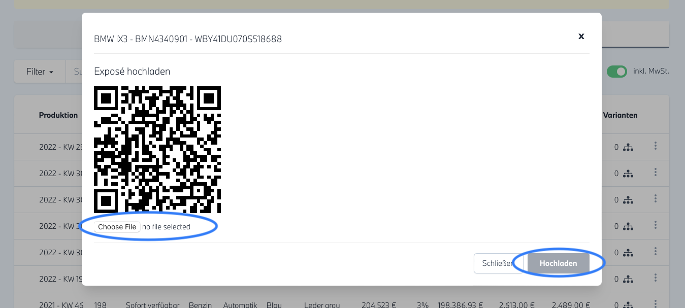 In der gleichen Ansicht klicken Sie bitte auf "Datei auswählen" und wählen anschließend das zu dem Fahrzeug gehörige Exposé als PDF-Datei aus. Abschließend klicken Sie bitte auf "Hochladen".