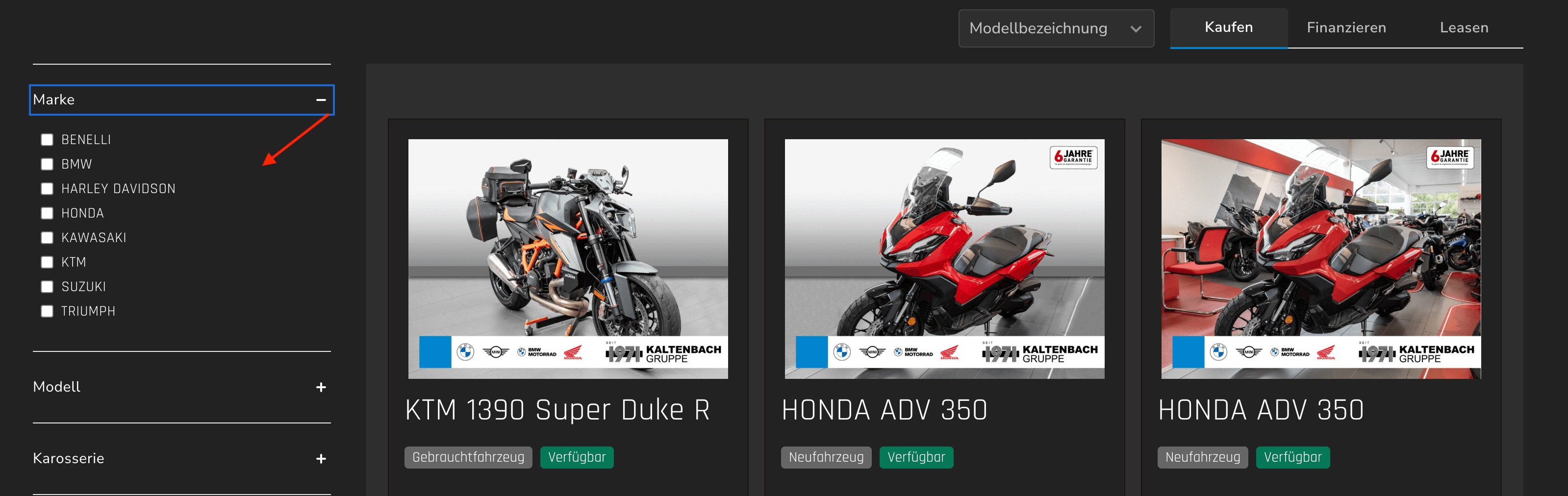 Sie finden die Fremdmarken sowie die Motorräder (sobald diese bei Ihnen aktiviert sind) direkt auf Ihrer Webseite.