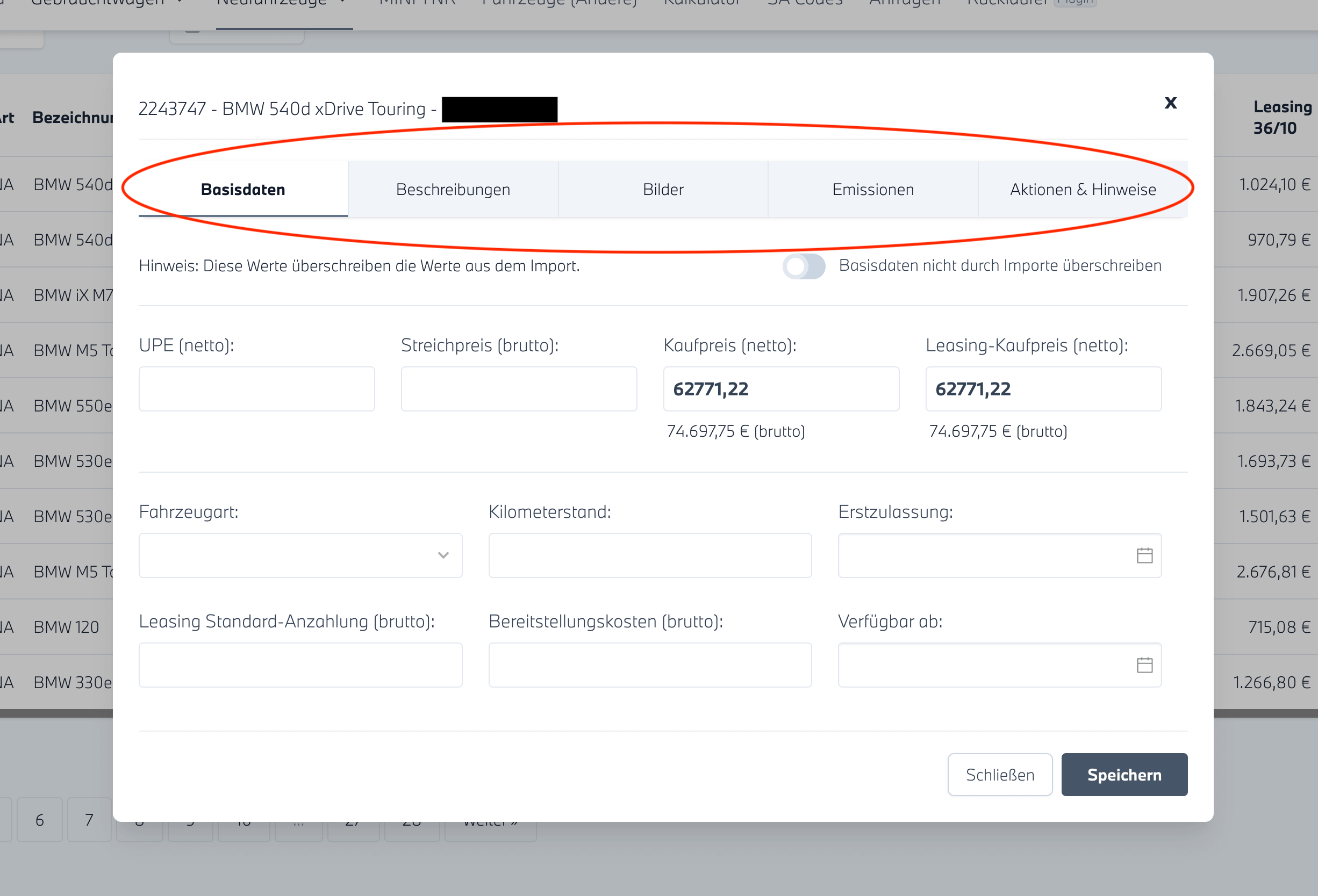 Die Fahrzeuge können als Neu- oder Gebrauchtwagen (Eigenbestand) bearbeitet werden. Gehen Sie dazu über den jeweiligen Reiter „Neu“ oder „Gebraucht“ auf den entsprechenden Bestand. Dort können Sie die gewünschten Fahrzeuge auswählen und bearbeiten.