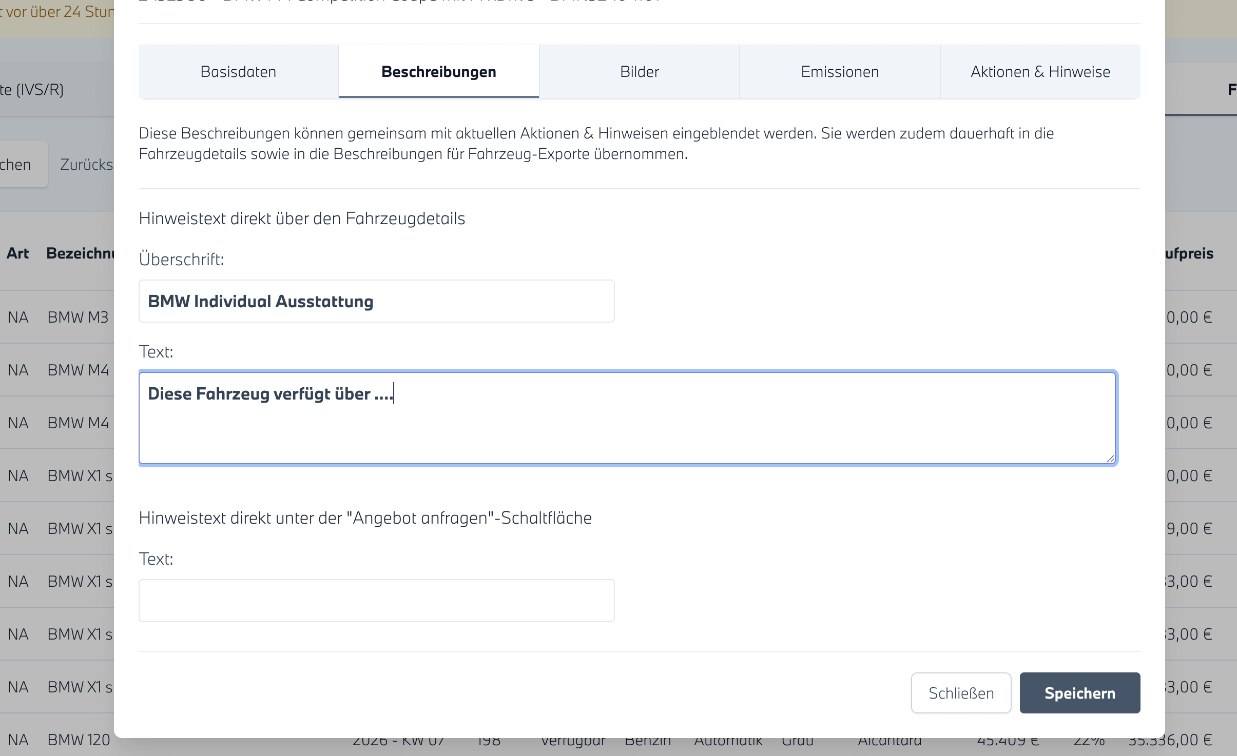 In der Beschreibung können alle weiteren Informationen zum Fahrzeug hinterlegt werden. Dazu gehören unter anderem:
