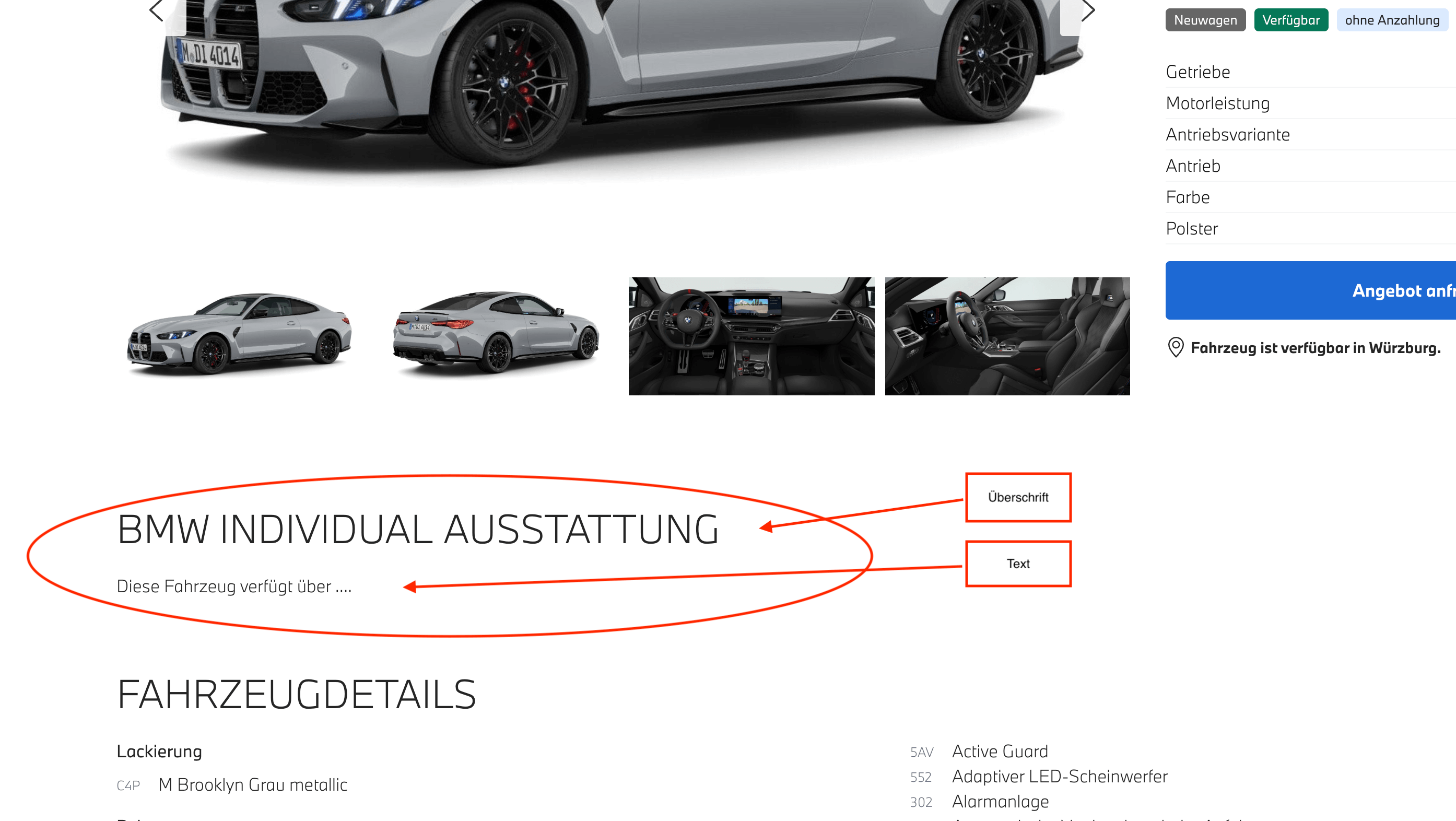 - Hinweistext Die hinterlegten Texte werden anschließend auf der Homepage beim jeweiligen Fahrzeug angezeigt (siehe Abbildung).