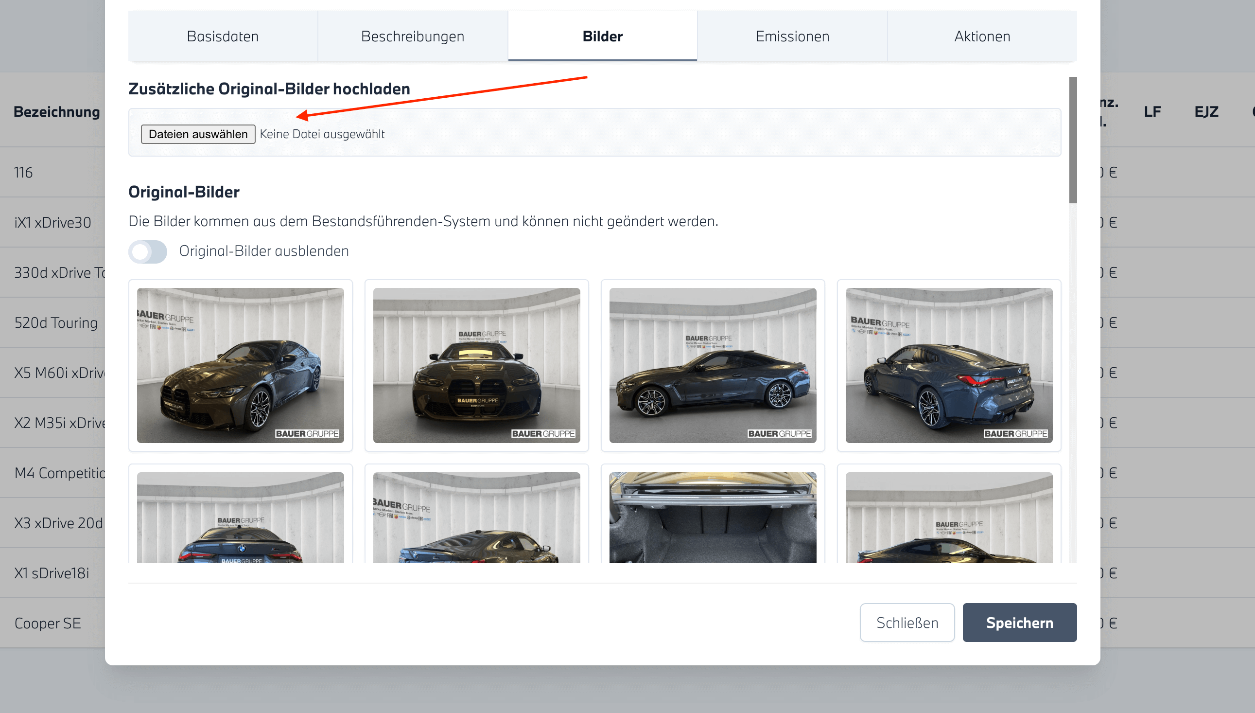 Im Feld Bilder können Sie zusätzliche Fahrzeugbilder hochladen. Die neuen Bilder werden jeweils als erstes Bild in der Galerie angezeigt. Die hochgeladenen Bilder sind nur innerhalb unseres Systems sichtbar.