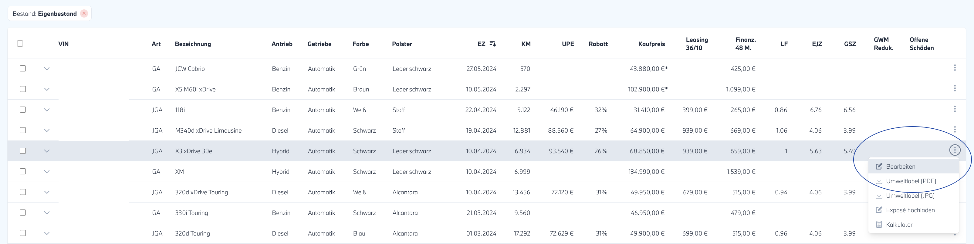 Die Daten zu ihrem Eigenbestand stammen aus ihrer Fahrzeugverwaltung. Daher können Sie hier z.B. nicht den Verkaufspreis ändern.