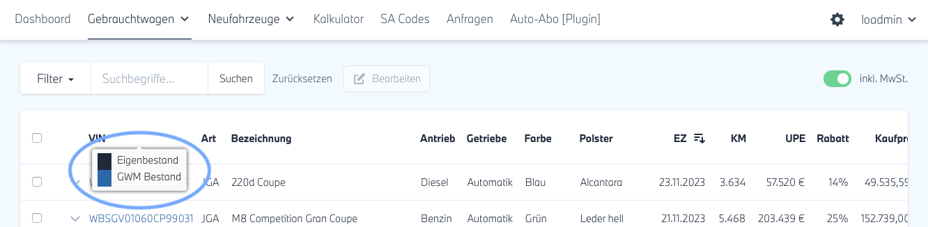 In der neu geöffneten, tabellarischen Ansicht über alle JGA- und GA-Fahrzeuge erkennen Sie ihre Eigenbestandsfahrzeuge anhand einer "schwarzen VIN" Sie können, indem Sie auf „Bestand“ unter „Filter“ klicken, einen Filter auf „Eigenbestand“ setzen. Alternativ können Sie im „Suchfeld“ daneben nach der entsprechenden Fahrgestellnummer suchen, die Sie bearbeiten möchten.