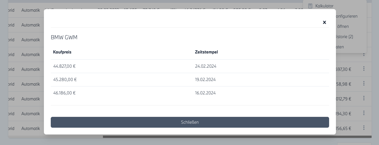 - In der neu geöffneten, tabellarischen Ansicht über alle JGA und GA Fahrzeuge können Sie über einen Klick auf die drei Punkte am jeweiligen Fahrzeug ganz rechts ein neues Menü öffnen und dort auf "Kaufpreis Historie" klicken.