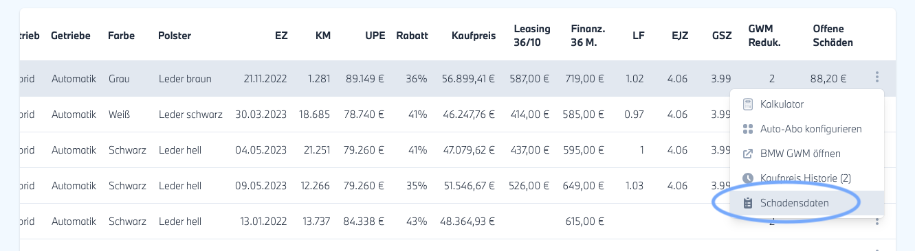 - In der neu geöffneten, tabellarischen Ansicht über alle JGA und GA Fahrzeuge können Sie über einen Klick auf die drei Punkte am jeweiligen Fahrzeug ganz rechts ein neues Menü öffnen und dort auf "Schadensdaten" klicken.