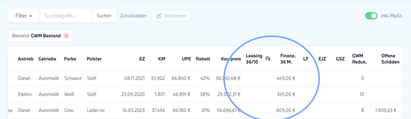 - Sollten "Leasing 36/10" und / oder "Finanz. 36 M." in der neu geöffneten, tabellarischen Ansicht über alle JGA und GA Fahrzeuge nicht gefüllt sein, ist das jeweilige Fahrzeug noch nicht berechnet. Wir berechnen für die Gebrauchtwagen nur die Finanzierung, für die Jungen Gebrauchten berechnen wir auch das Leasing, ist hier das Feld "Leasing 36/10" nicht gefüllt, sind die JGA nicht mehr leasingfähig.