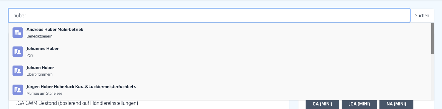- Sie können - Firmenname, Name, Kennzeichen, Telefon, Email, etc. - in dem Suchschlitz eingeben und danach suchen. MSearch wird Ihnen schon beim Tippen passende Suchergebnisse vorschlagen, welche Sie durch Klicken auswählen können um auf die Detailansicht zu gelangen.