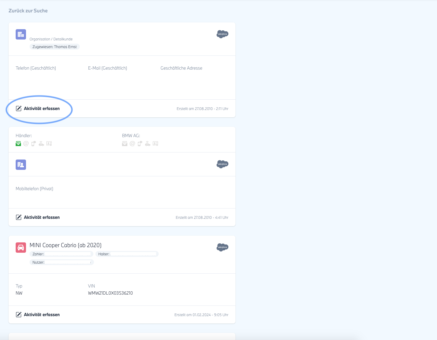 - Auf der so neu geöffneten Detailansicht des gewählten Kunden sehe Sie alle im RSP CRM für den gewählten Kunden verfügbaren Daten, Vorgänge und Fahrzeuge. Durch Klick auf "Aktivität erfassen" können Sie für das gewünschte Objekt eine Aktivität erfassen.