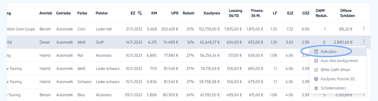 - Klicken Sie nach dem Login auf die gewünschte Fahrzeugkategorie (Gebrauchtwagen oder Neufahrzeuge) und klicken Sie in der neu geöffneten, tabellarischen Ansicht in der Zeile des gewünschten Fahrzeugs ganz rechts auf die drei Punkte und im neu geöffneten Menu auf "Kalkulator".