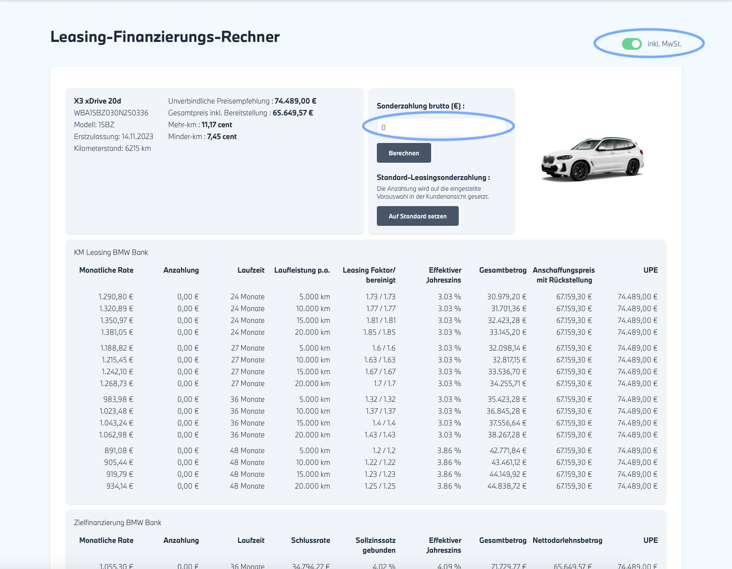 - Auf der durch diese beiden Wege geöffneten, neuen Ansicht "Leasing-Finanzierungs-Rechner" sehen Sie alle Details zur Kalkulation des Fahrzeugs sowie alle Raten-Variationen. Durch Erfassung einer optionalen "Sonderzahlung" mit anschließendem Klick auf "Berechnen" sehen Sie unmittelbar, wie sich die konfigurierte Sonderzahlung auf die Raten auswirkt. Außerdem können Sie durch Klick auf den Toggle-Button "inkl. MwSt." oben rechts zwischen brutto und netto wechseln.