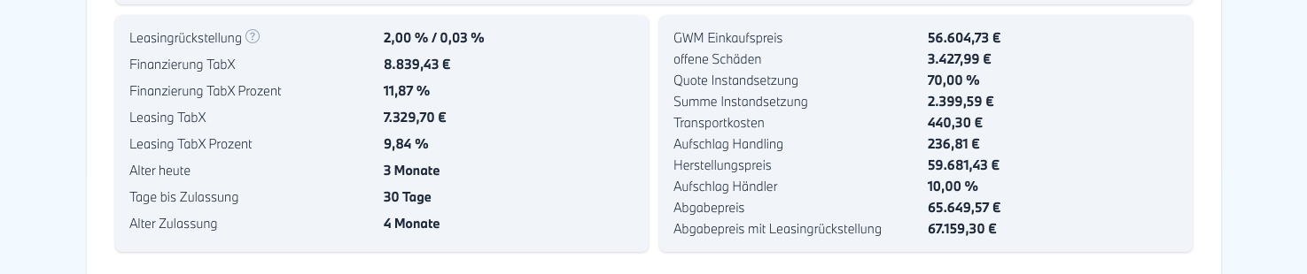 - Im unteren Teil der Ansicht finden Sie außerdem weitere hilfreiche Details der Kalkulation bei JGA-Fahrzeugen wie die Leasingrückstellung, TabX, Alter und bei GWM Fahrzeugen weitere GWM-spezifische Details wie Einkaufspreis, offene Schäden, etc.