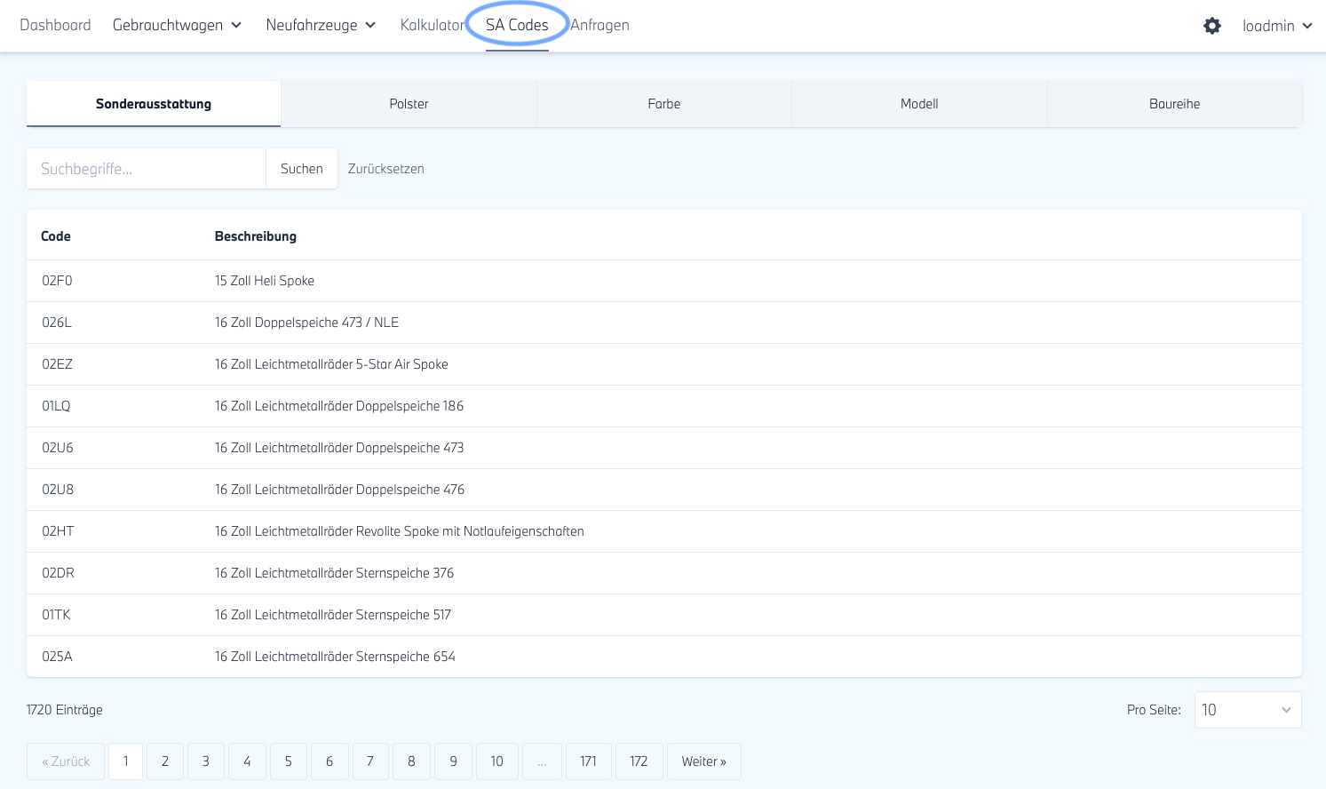 Der Katalog kann einfach und schnell über eine Suchfunktion im Freitext genutzt werden. Wenn Sie also z.B. das Wort "Laser" suchen, finden Sie den Code 05AZ für die Sonderausstattung "BMW Laserlicht".