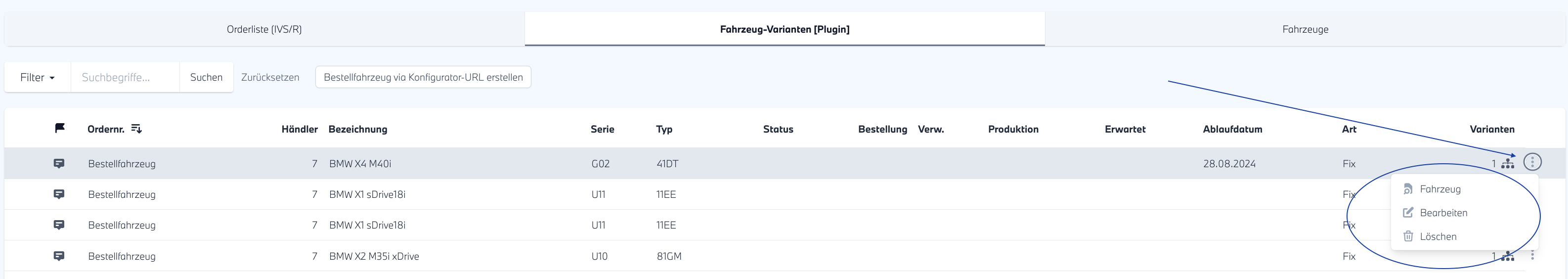 - Wenn Sie auf die drei Punkte am Ende der Zeile des Fahrzeuges klicken, gelangen Sie über den Button "Fahrzeug",in den Fahrzeugbereich, genau auf das entsprechende Fahrzeug, welches Sie gerade generiert haben, hier können Sie es jetzt wie gewohnt bearbeiten oder auch als Aktionsfahrzeug kennzeichnen. Auch unter den drei Punkten gibt es ein "bearbeiten", wo Sie beispielsweise das Ablaufdatum anpassen können.