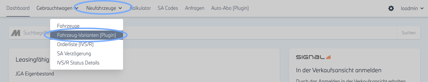 Klicken Sie nach dem Login auf "Neufahrzeuge" und wählen Sie im neu geöffneten Menü "Fahrzeug-Varianten".