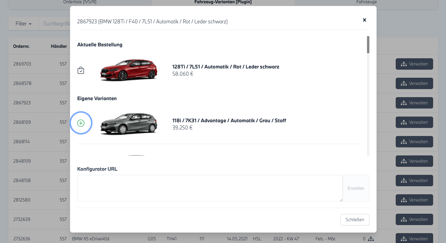 - Sofern für die Baureihe bereits Varianten existieren, werden Ihnen diese unter "Eigene Varianten" aufgelistet. Durch einen Klick auf das "grüne Plus" können Sie die konfigurierte Variante für diese NA Vorlauf Fahrzeug erstellen.