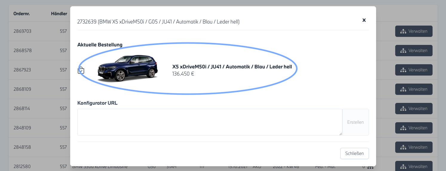 Klicken Sie auf den Button "Bestellfahrzeug via Konfigurator-URL erstellen". (Der Button ist nur sichtbar, wenn er zuvor bei uns freigeschaltet wurde)