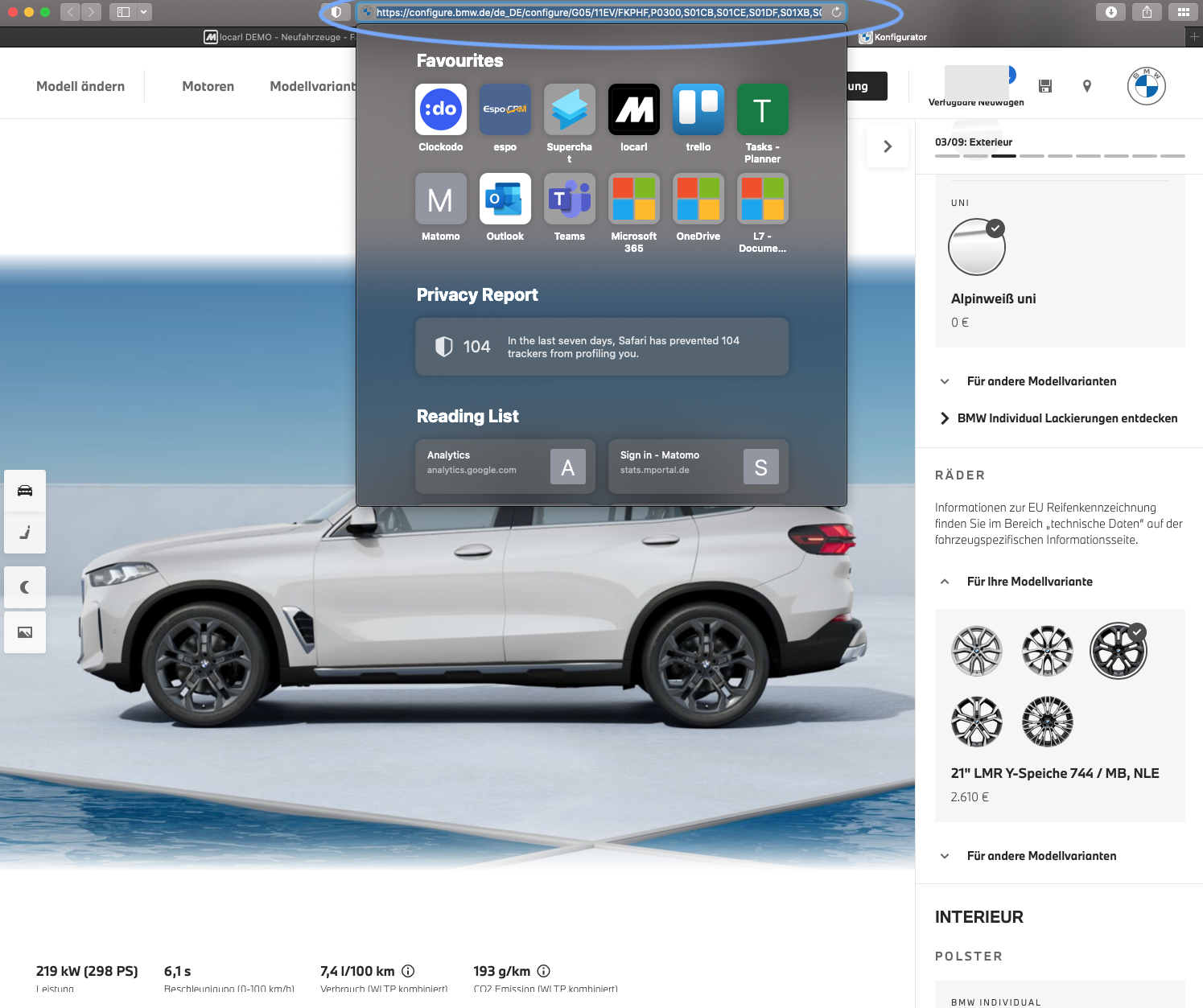 - Im BMW Konfigurator können Sie nun nach Belieben Anpassungen an dem NA im Vorlauf vornehmen - Sie können dabei alles außer der Baureihe ändern (auch das Modell bzw. die Motorisierung kann geändert werden). Wenn Sie die Konfiguration abgeschlossen haben, kopieren Sie bitte den vollständigen Link aus der Browser-Leiste.