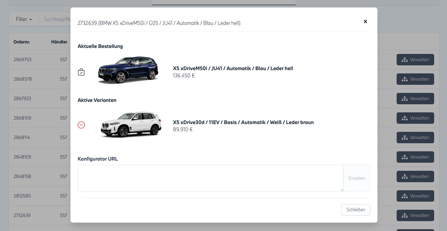 - In der neu geöffneten Ansicht sehen sie das gewählte Basis NA Fahrzeug im Vorlauf sowie darauf eventuell bereits angelegte Varianten. Mit einem Klick auf das Fahrzeug gelangen Sie in den BMW Konfigurator für das Fahrzeug.
