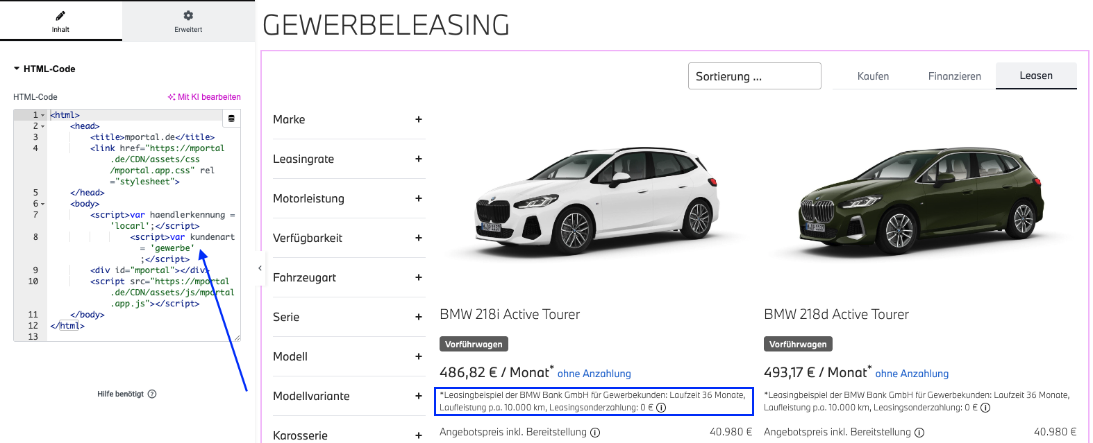Wie kann ich die Gewerbekunden-Leasingraten auf meiner Website als separate Seite einbinden?