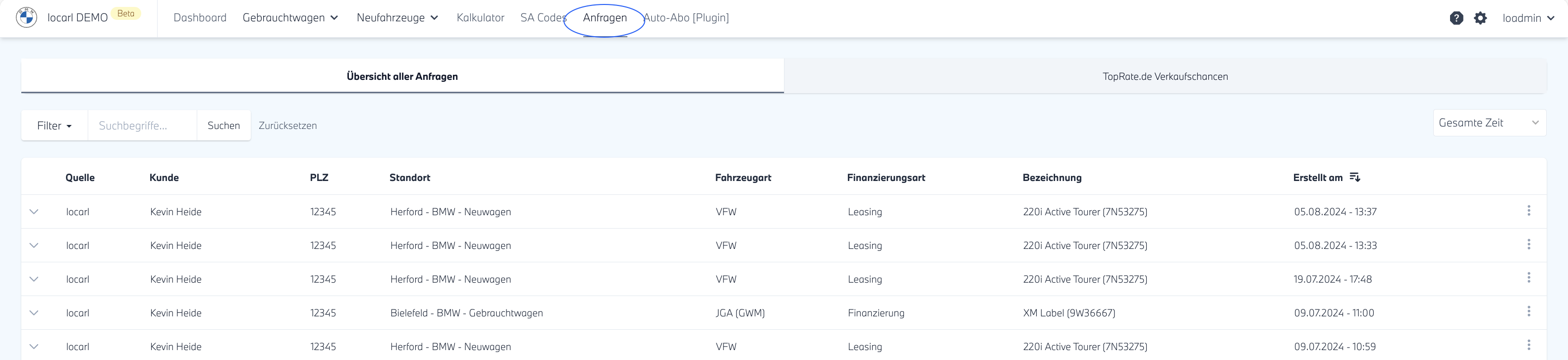 In der neu geöffneten, tabellarischen Ansicht finden Sie alle über die locarl Fahrzeug-Darstellung auf Ihrer Website eingegangen Anfragen und die von TopRate mit allen relevanten Informationen.