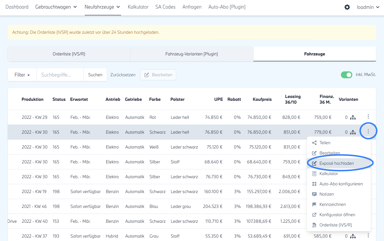 Klicken Sie beim gewünschten Fahrzeug ganz rechts auf die drei Punkte und wählen in dem dadurch neu geöffneten Menü "Exposé hochladen".