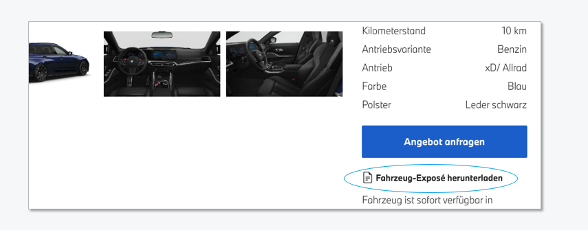 - Nach erfolgreichem Hochladen erscheint auf der jeweiligen Fahrzeugdetailseite unterhalb des Anfrage-Buttons der Button "Fahrzeug-Exposé herunterladen", der nun auf des hochgeladene Exposé führt.