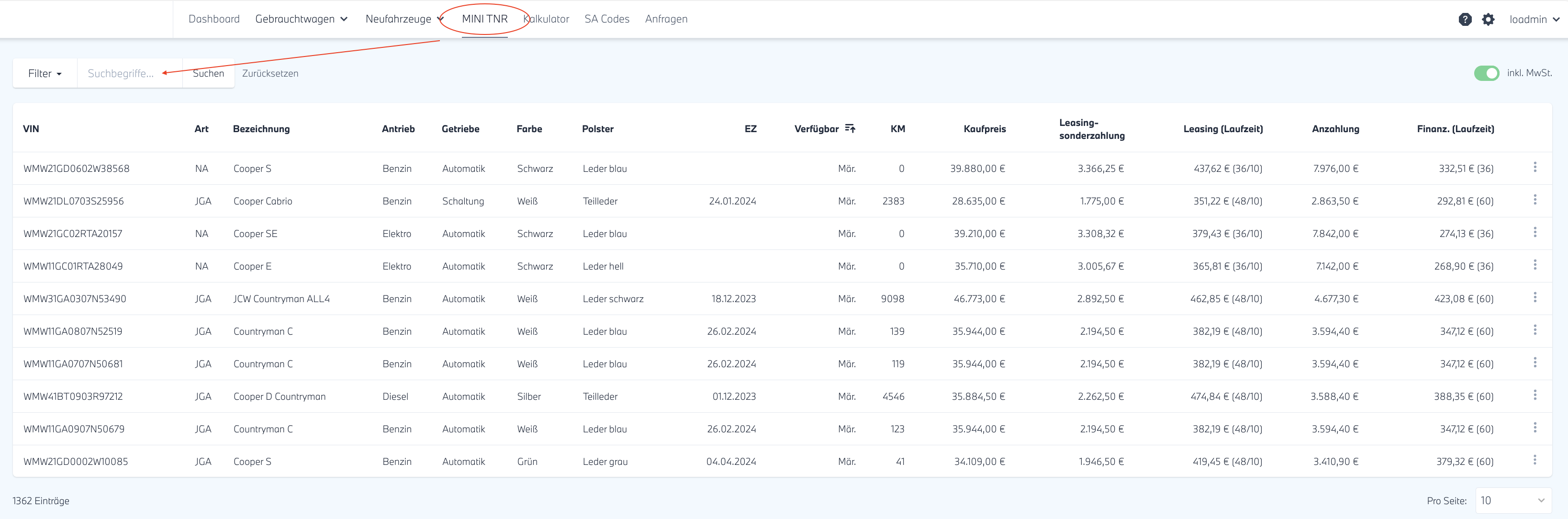 Im Login-Bereich finden Sie den Menüpunkt „Fahrzeug (Andere)“. Dort erhalten Sie eine tabellarische Übersicht aller Fahrzeuge. Über das Suchfeld können Sie gezielt nach einem Fahrzeug suchen – zum Beispiel durch Eingabe der Angebotsnummer.
