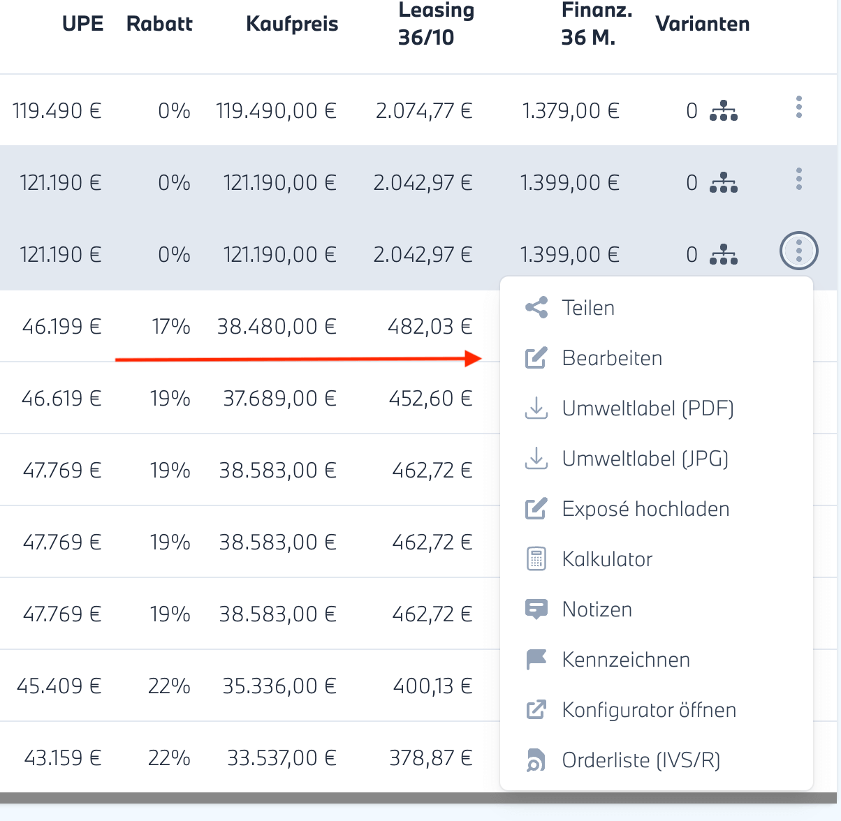 Fahrzeuge können nur einzeln bearbeitet werden. Nach Klick auf die Punkte öffnet sich das Menü mit der Option „Bearbeiten“.