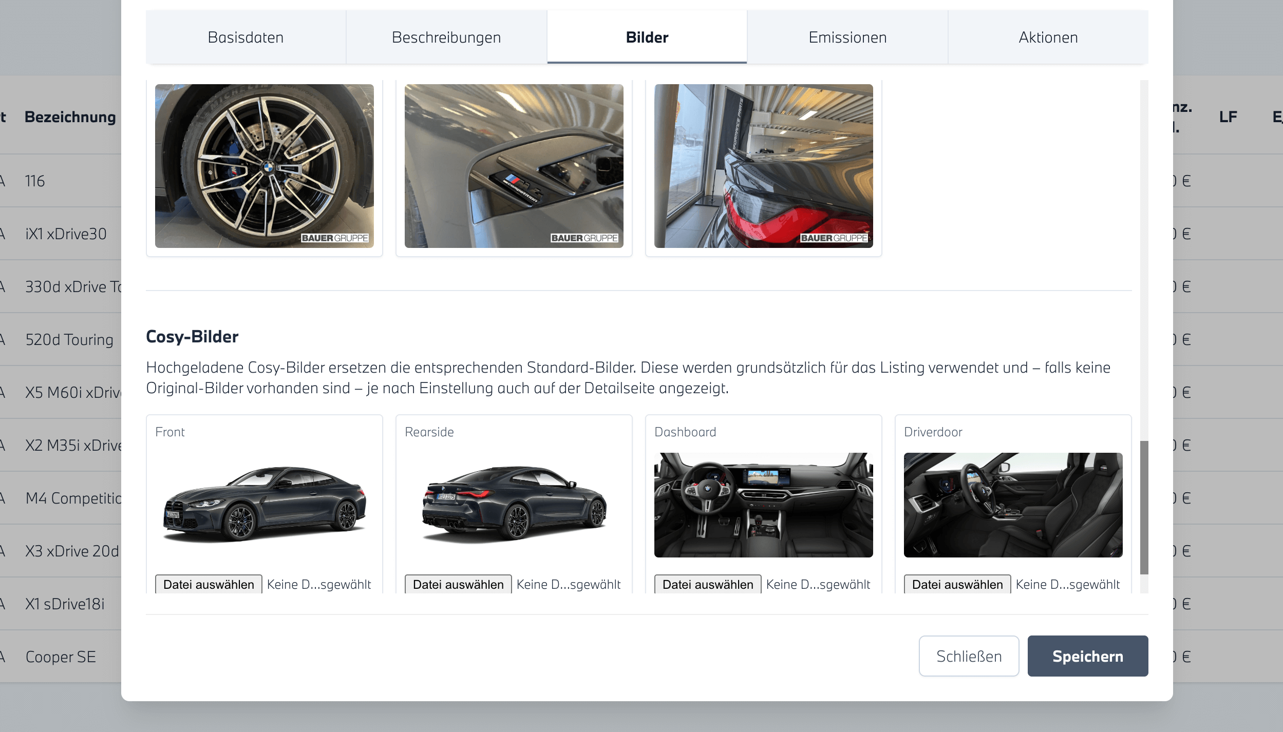 Im Feld Bilder können Sie zusätzliche Fahrzeugbilder hochladen. Die neuen Bilder werden jeweils als erstes Bild in der Galerie angezeigt. Die hochgeladenen Bilder sind nur innerhalb unseres Systems sichtbar.