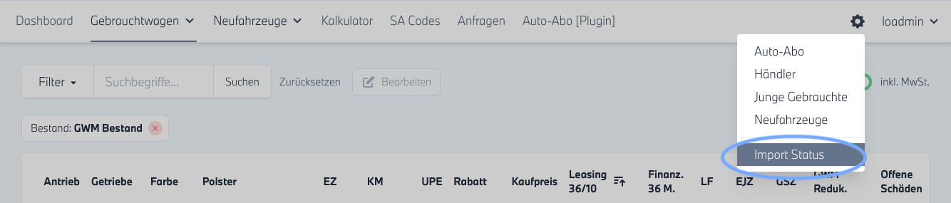 - Klicken Sie nach dem Login auf das "Zahnrad" oben rechts und wählen im neu geöffneten Menü den Punkte "Import Status".