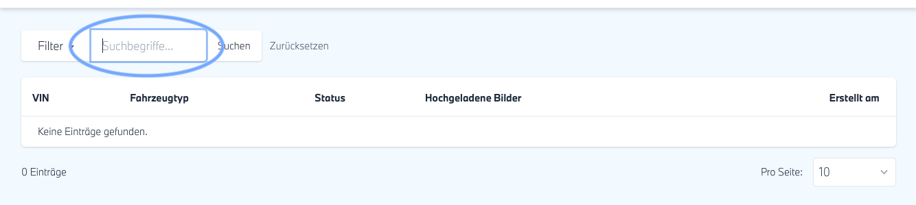 Sie können oben links über das "Suchfeld" nach der VIN eines Fahrzeugs suchen und so den Importstatus prüfen.