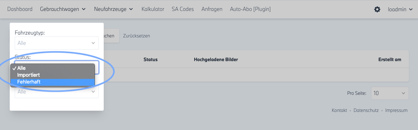 Stellen Sie den Filter auf "Fehlerhaft" nur die Fahrzeuge, deren Import fehlerhaft war, anzuzeigen.