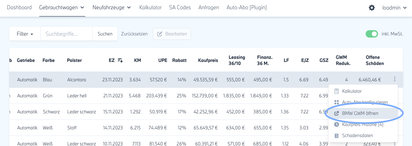 - Wenn Sie im S-Gate angemeldet sind, können Sie über einen Klick auf die drei Punkte am jeweiligen Fahrzeug ganz rechts ein neues Menü öffnen und dort auf "BMW GWM öffnen" klicken, um das Fahrzeug direkt im GWM System zu öffnen. Dies ist empfehlenswert um die Verfügbarkeit zu prüfen oder das Fahrzeug direkt abzurufen.