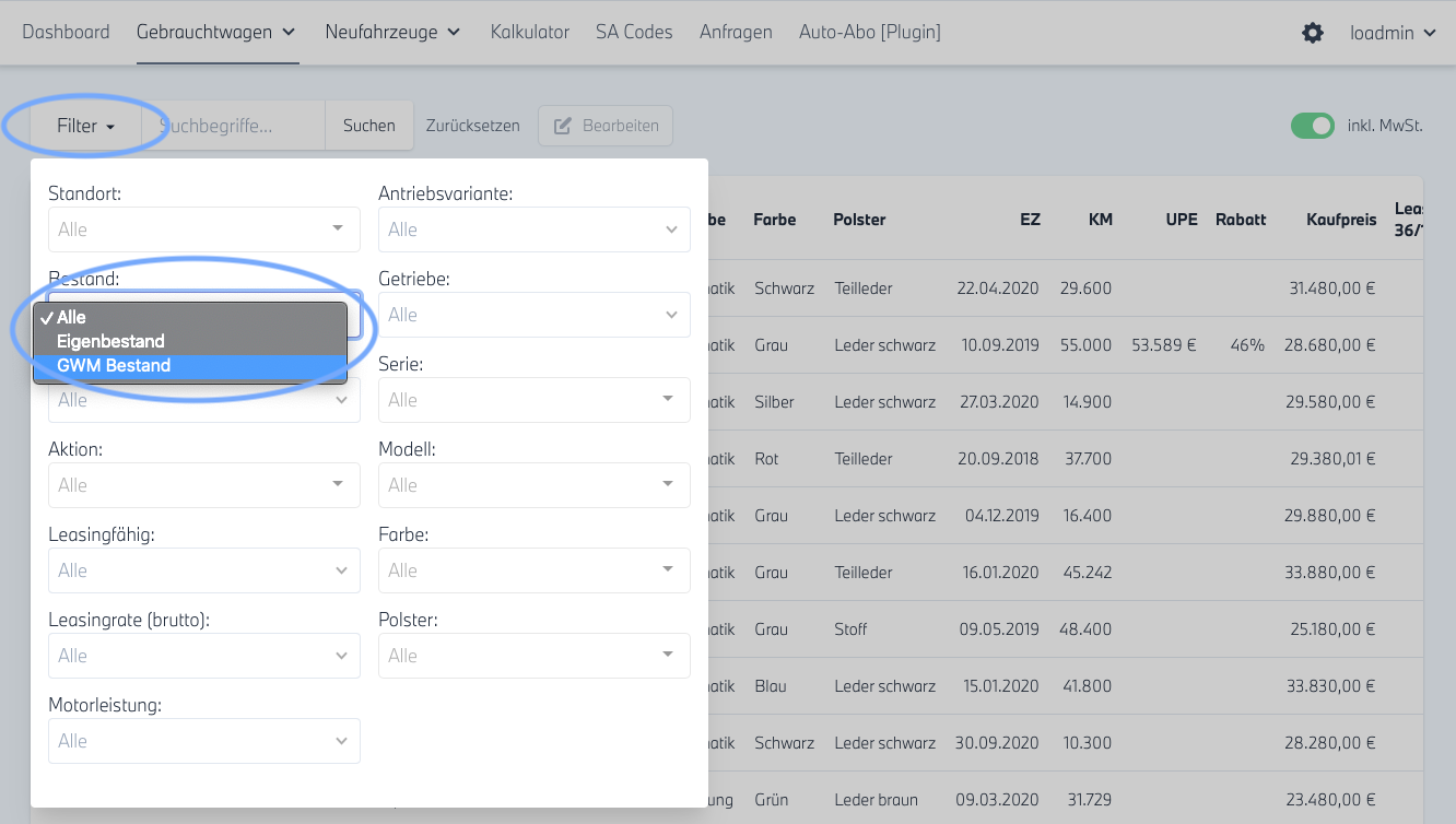 Mit einem Klick auf "Filter" oben links können Sie in der neu geöffneten Ansicht unter "Bestand" einen Filter auf GWM Fahrzeuge setzen