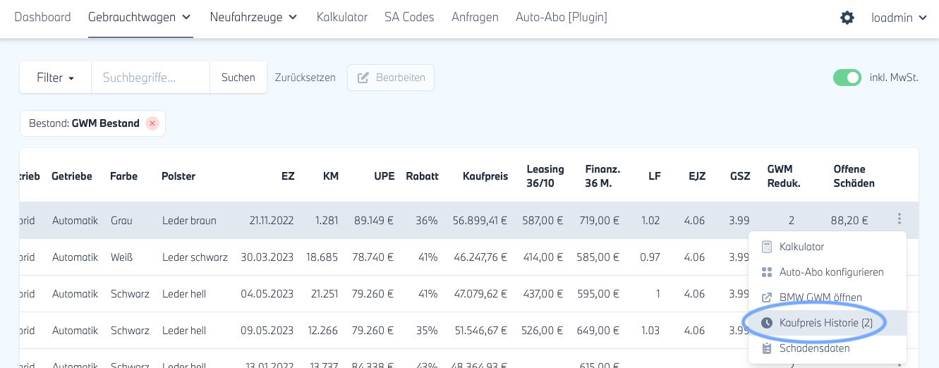 - In der neu geöffneten, tabellarischen Ansicht über alle JGA und GA Fahrzeuge können Sie über einen Klick auf die drei Punkte am jeweiligen Fahrzeug ganz rechts ein neues Menü öffnen und dort auf "Kaufpreis Historie" klicken.