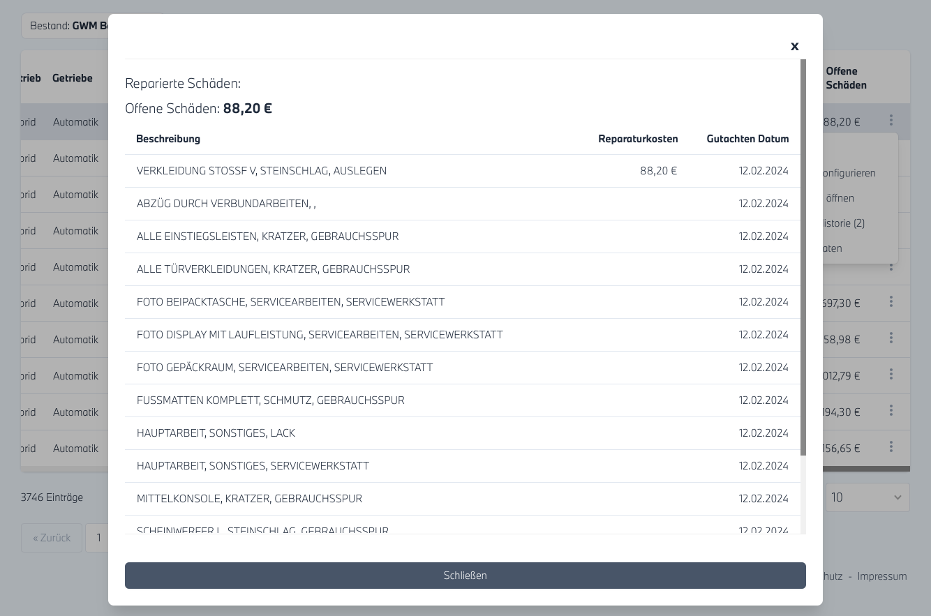 - In der neu geöffneten Ansicht finden Sie eine gut lesbare, einfach aufbereitete und vollständige Ansicht der Schadensdaten für das jeweilige Fahrzeug.