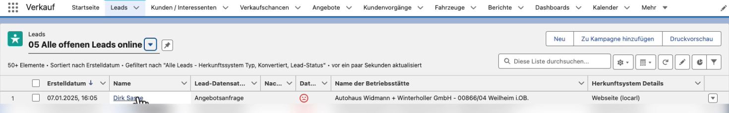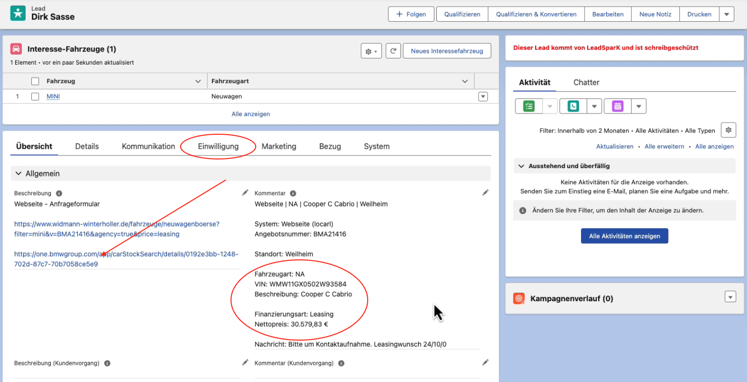 Der Lead enthält alle Details zum angefragten Mini, die Werbeeinwilligung und die Adressdaten. Über den zweiten Link in der Beschreibung, landen Sie direkt in dem BMW ONE System und können von hieraus das Angebot erstellen.
