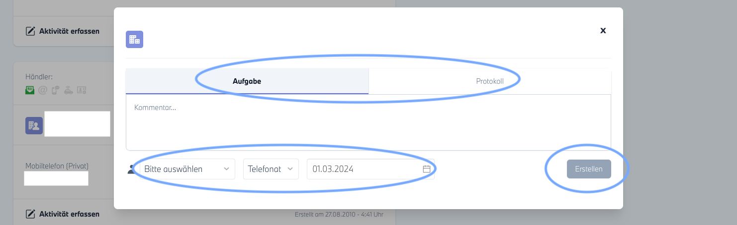 - Bei der so neu geöffneten Ansicht zur Erfassung der Aktivität können Sie zwischen einer "Aufgabe" und einem "Protokoll" unterscheiden. Sie können dann im Kommentar-Feld die gewünschten Informationen erfassen (auf dem Smartphone können Sie hierfür auch ganz bequem und schnell die Diktierfunktion nutzen). Abschließend können Sie die Aktivität einer Person zu ordnen, eine nächste Aktivität und ein Fälligkeitsdatum festlegen. Mit Klick auf "Erstellen" wird die Aktivität erstellt und in das RSP CRM geschrieben.