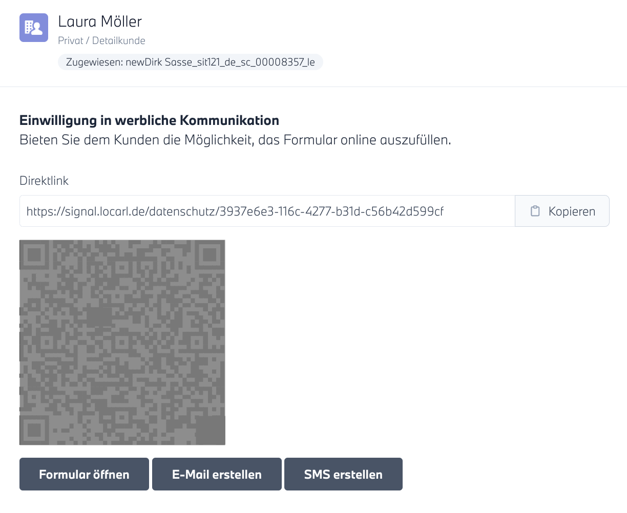 Sie haben die Möglichkeit, das Formular per E-Mail oder SMS an den Kunden zu senden. Wenn der Kunde vor Ihnen steht, kann er auch den QR-Code scannen und die Häkchen selbst setzen. Über „Formular öffnen“ können Sie in Absprache mit dem Kunden die Häkchen ebenfalls setzen.