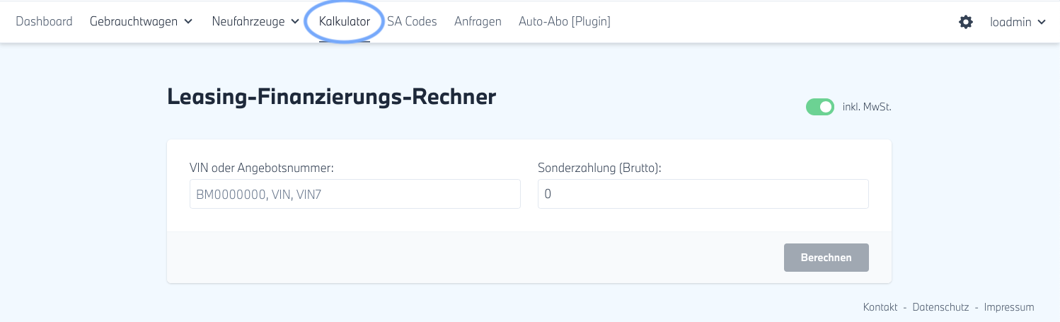 - Klicken Sie nach dem Login in der Menu-Leiste oben mittig auf "Kalkulator". In der neu geöffneten Ansicht können Sie anhand der VIN, VIN7 oder Angebotsnummer und auf Wunsch einer Sonderzahlung eine entsprechende Kalkulation erstellen.