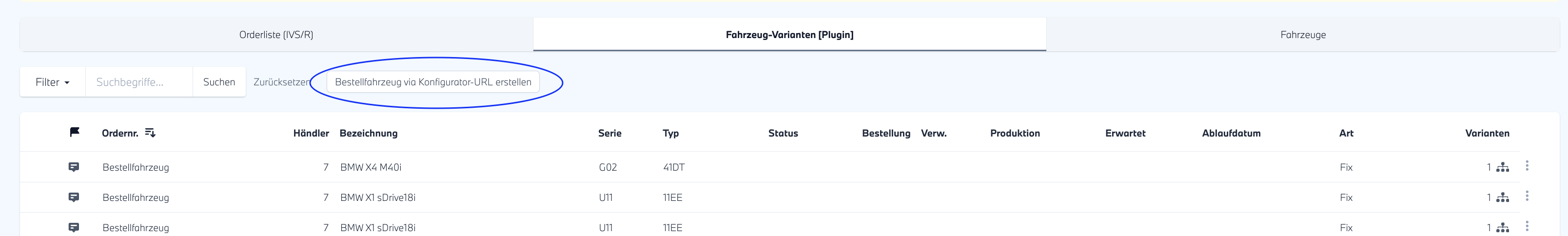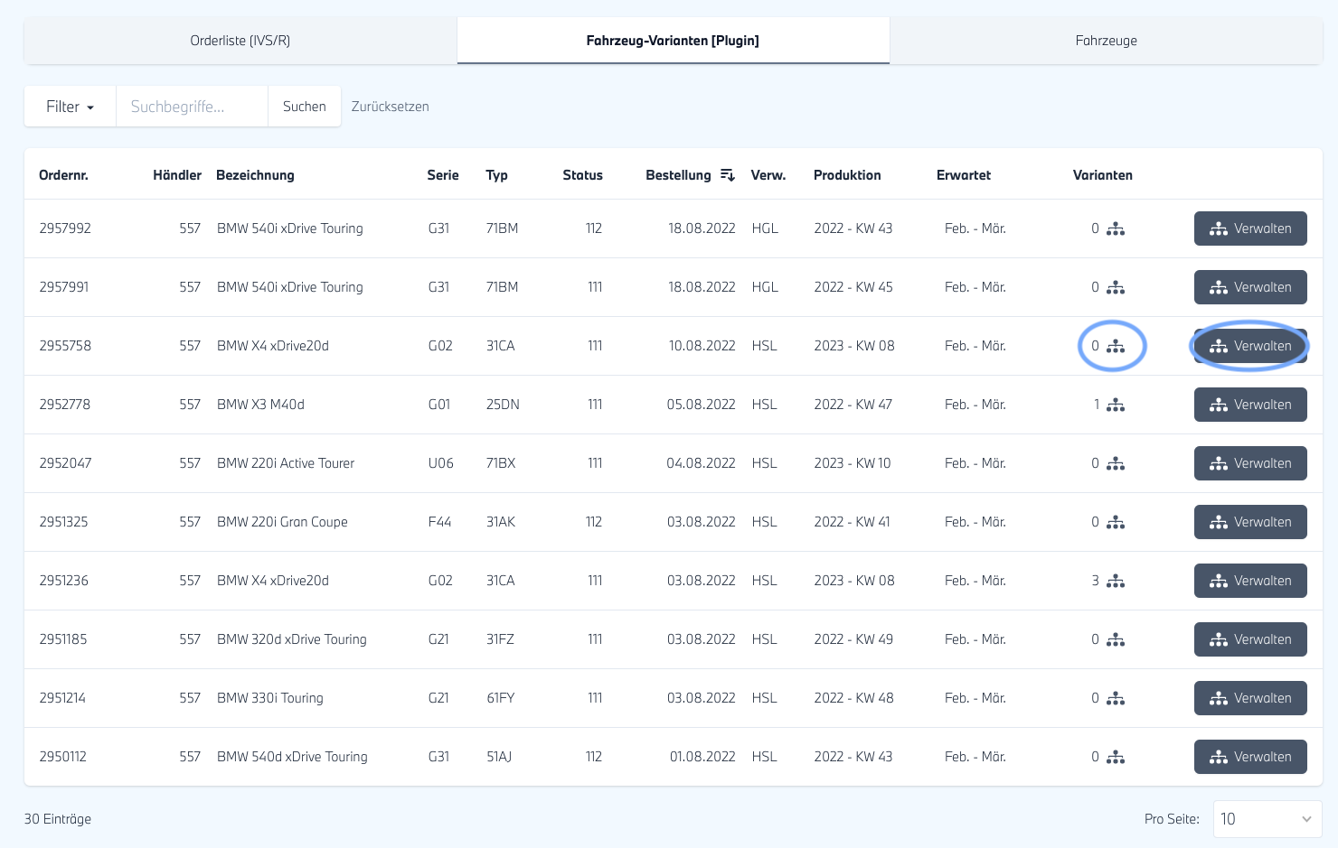 - In der neu geöffneten Ansicht finden Sie eine tabellarische Ansicht aller Fahrzeuge, für die Sie eine Variante anlegen können. Anhand der Spalte "Varianten" erkennen Sie außerdem, ob bereits Varianten angelegt sind und können die Liste auch danach sortieren. Mit einem Klick auf den Button "Verwalten" starten Sie den Prozess.