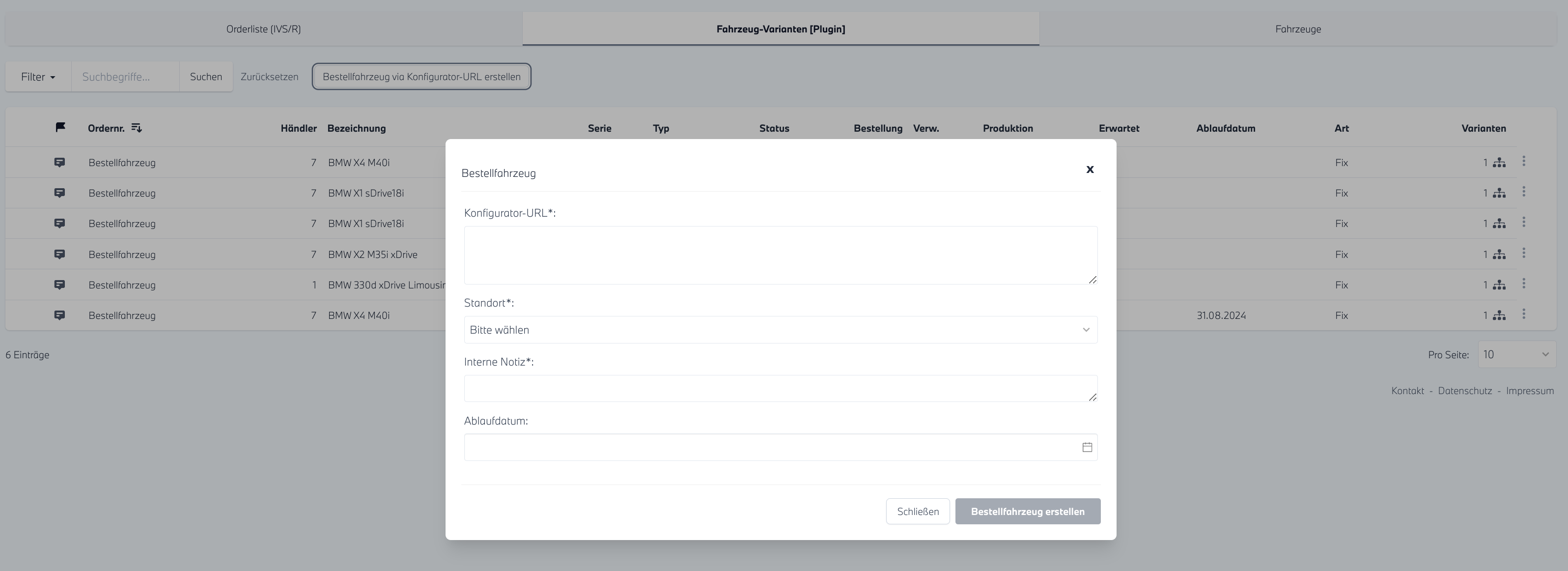 - In dem sich öffnenden Fenster können Sie eine Konfigurator-URL einfügen. Sie haben die Möglichkeit, ein Ablaufdatum einzutragen, welches in der Zukunft liegen muss. Wird dieses Datum erreicht, löscht sich die fixe Variante automatisch. Zudem sind Standort und die interne Notiz Pflichtfelder. Anhand des Standortes werden die Leads weitergeleitet. Die interne Notiz dient dazu, dass Sie dieses Fahrzeug beispielsweise als Marketingmaßnahme kennzeichnen können.