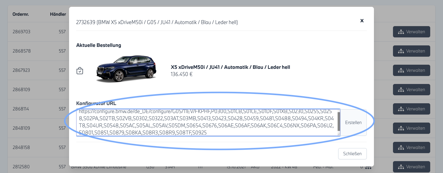 Klicken Sie auf den Button "Bestellfahrzeug via Konfigurator-URL erstellen". (Der Button ist nur sichtbar, wenn er zuvor bei uns freigeschaltet wurde)