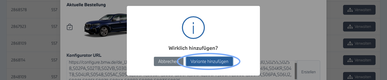 - In der neu geöffneten Ansicht sehen sie das gewählte Basis NA Fahrzeug im Vorlauf sowie darauf eventuell bereits angelegte Varianten. Mit einem Klick auf das Fahrzeug gelangen Sie in den BMW Konfigurator für das Fahrzeug.