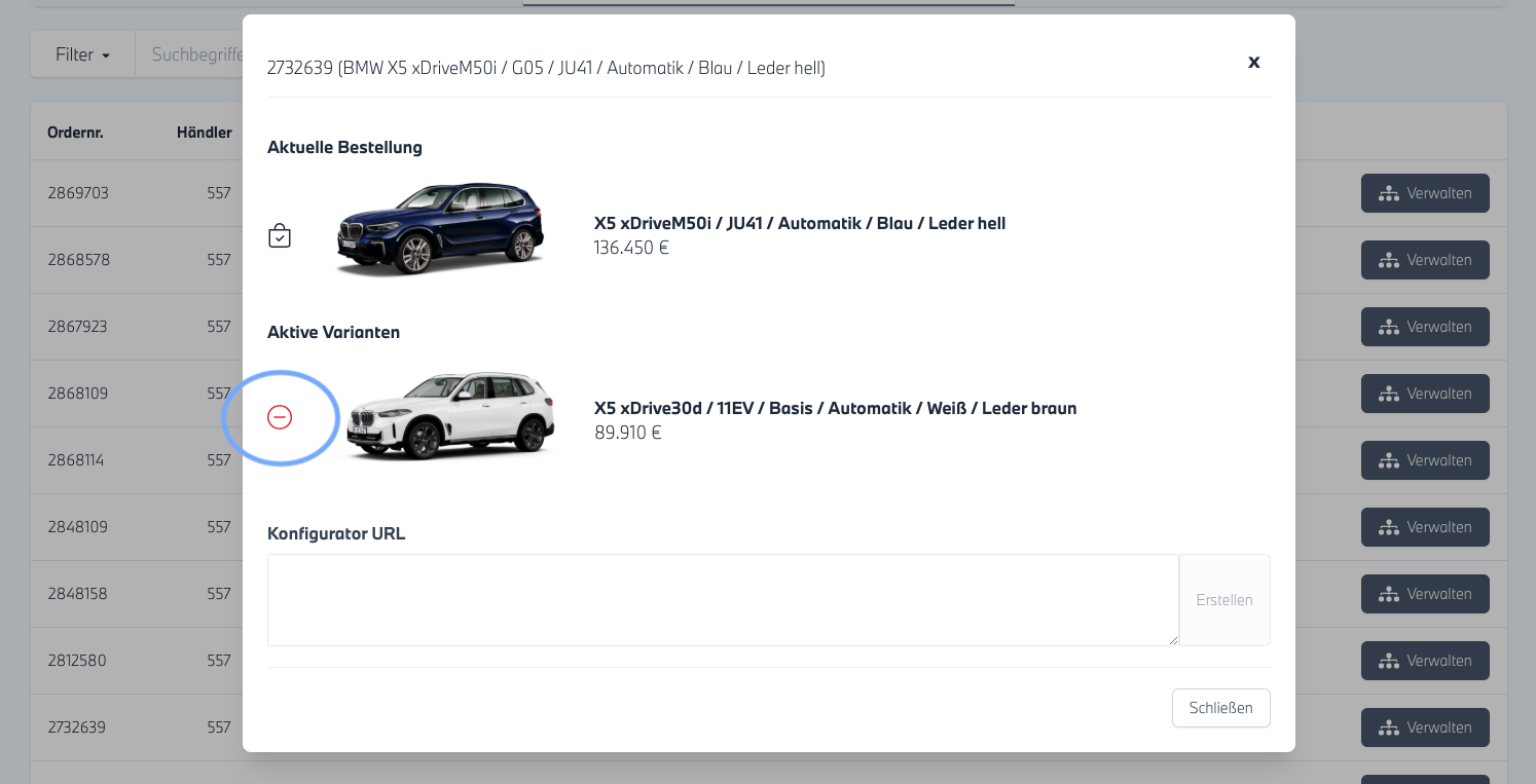 - Sofern für das Fahrzeug aktive Varianten existieren, werden Ihnen diese unter "Aktive Varianten" aufgelistet. Durch einen Klick auf das "rote Minus" können Sie die Variante löschen.